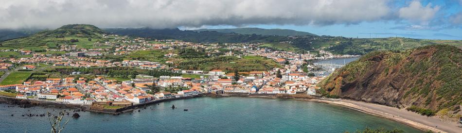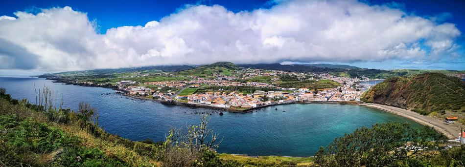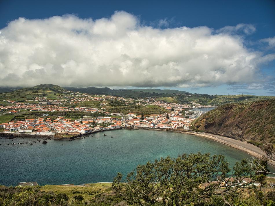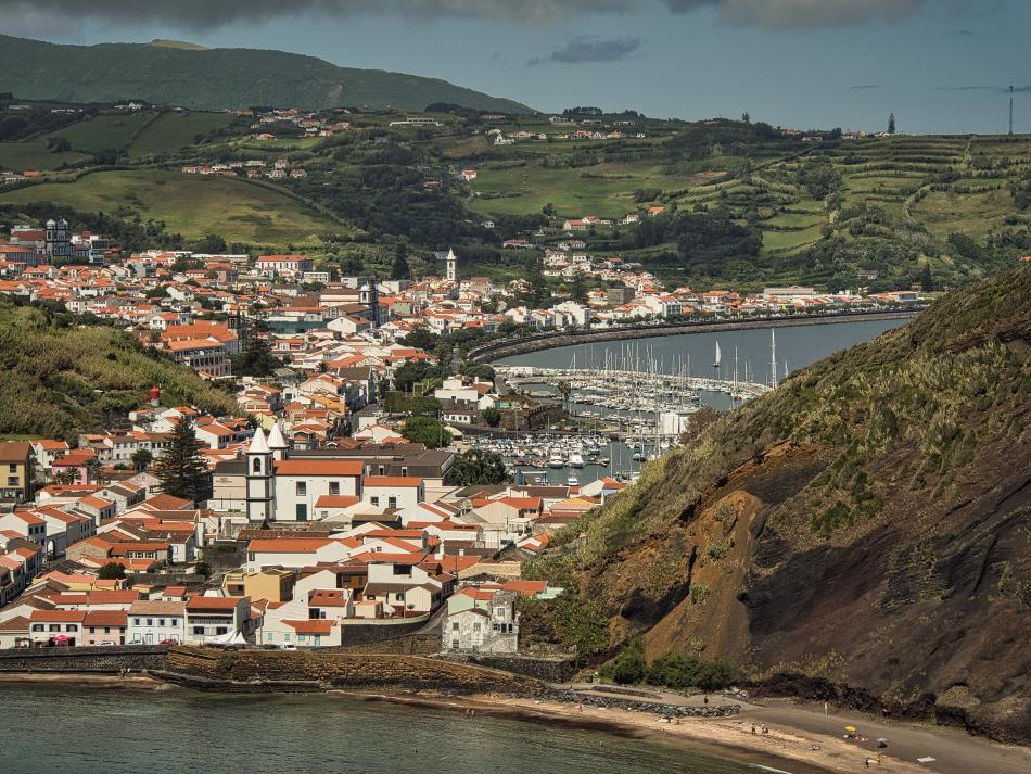 Auf dem Weg weiter den Berg hinauf gab es nach einigen wenigen Metern schon den nächsten Aussichtspunkt. Ziemlich Mittig auf dem Berg, wenn auch noch nicht an der höchsten Stelle, gab es einen langen Seitenstreifen, auf dem wir das Auto abstellen konnten. Von hier aus hatten wir eine wirklich tolle Sicht über den Strand Porto Pim und über einen Großteil der Stadt Horta, von der wir ja eigentlich noch gar nichts gesehen hatten.