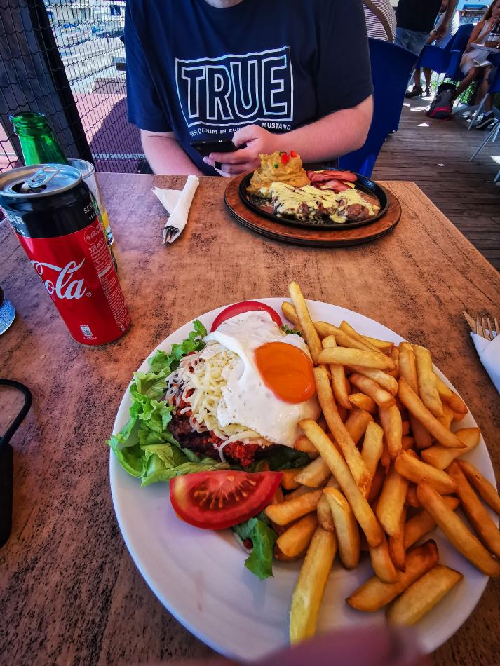 Die ganzen Peter-Gebäude befinden sich auf der anderen Seite einer Alleestraße, die von Autos befahren wird – aber das Peter Cafe Sport hatte auf der Seite in Richtung Meer dieser Allee, noch eine relativ neue und großzügige Terrasse gebaut. Hier standen noch bestimmt 10-15 Tische, die allesamt sehr gut besucht waren. Am Eingang dieser Terrasse mussten wir kurz warten, um einen Tisch zugewiesen zu bekommen (das war schon gar nicht so einfach – wegen Corona musste auch jeder Tisch erst desinfiziert werden, bis die nächsten Gäste ihn nutzen durften). Als wir saßen, haben wir bestellt, mussten allerdings recht lange auf unser Essen warten, das dann aber ziemlich lecker war. Paul hatte ein lokales Fleischgericht mit richtig gutem Süßkartoffelpüree, Laura einen Burger on a plate, also Burger ohne Brot, mit Pommes. Richtig leckeres Essen. Die Terrasse war gut überdacht, sodass wir trotz der starken Sonne hier sehr gut sitzen konnten. Leider mussten wir hier den Namen mitbezahlen, aber obwohl das hier eine Once-in-a-lifetime-Erfahrung ist, hat sie das Budget nicht gesprengt.