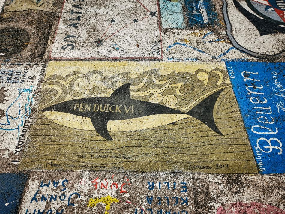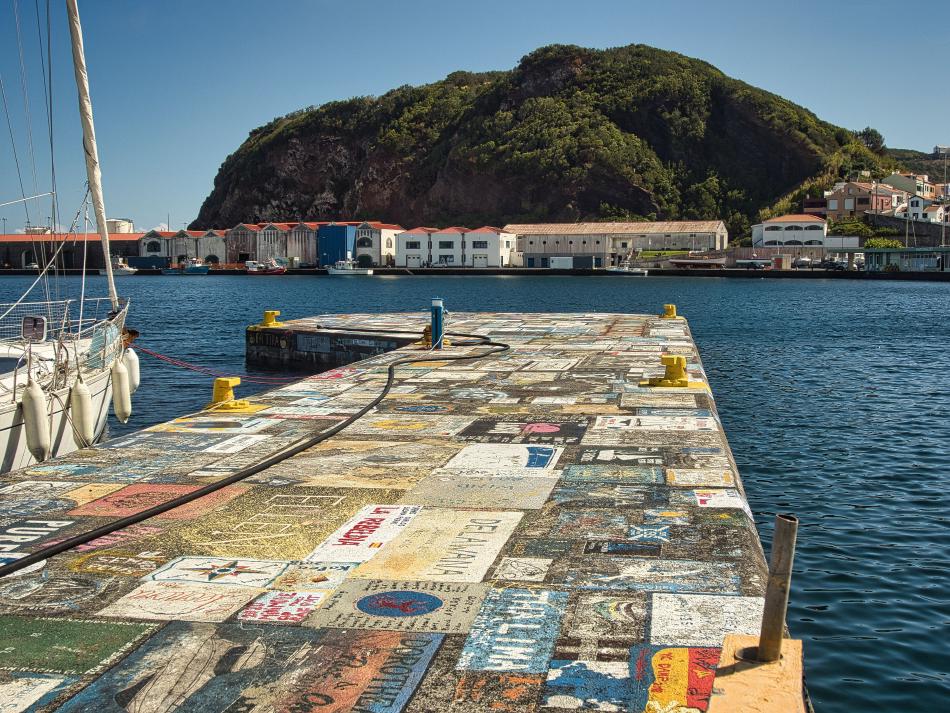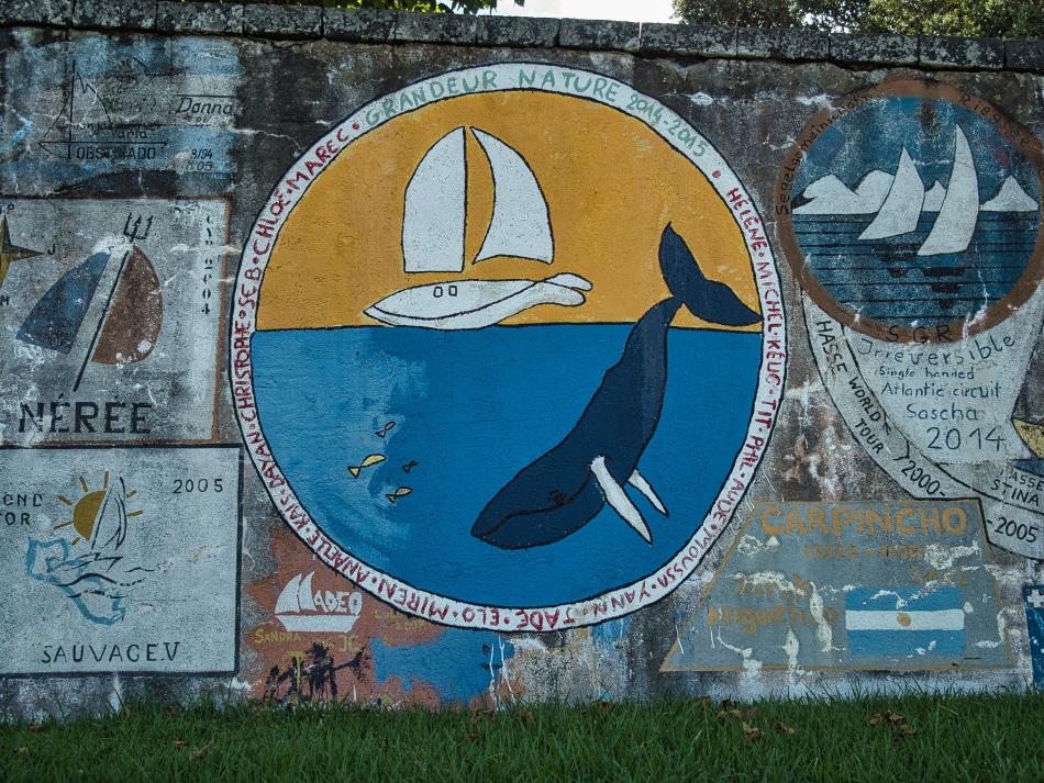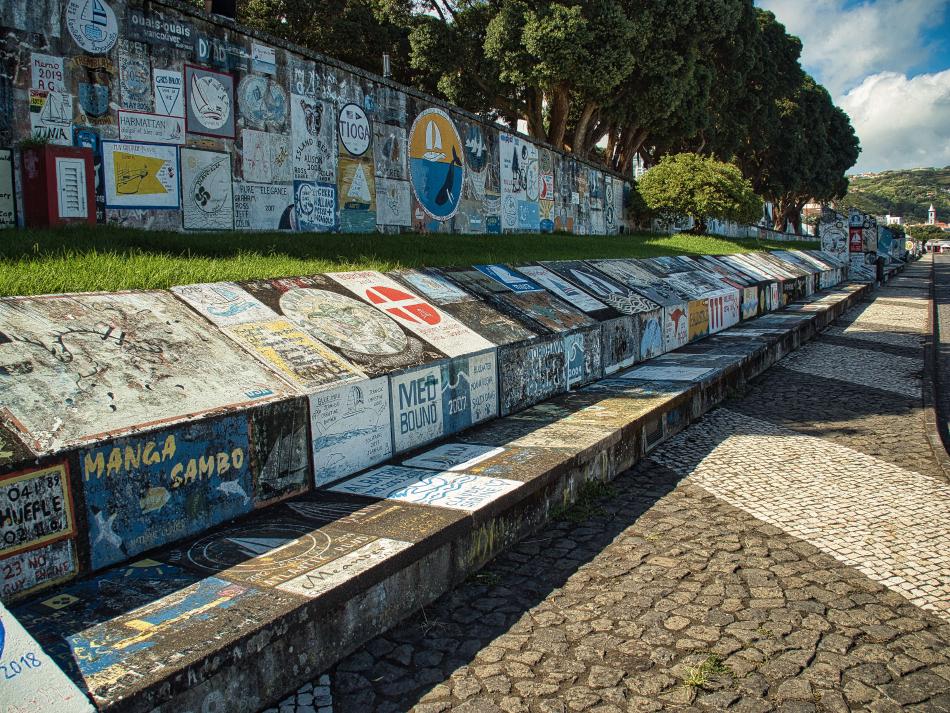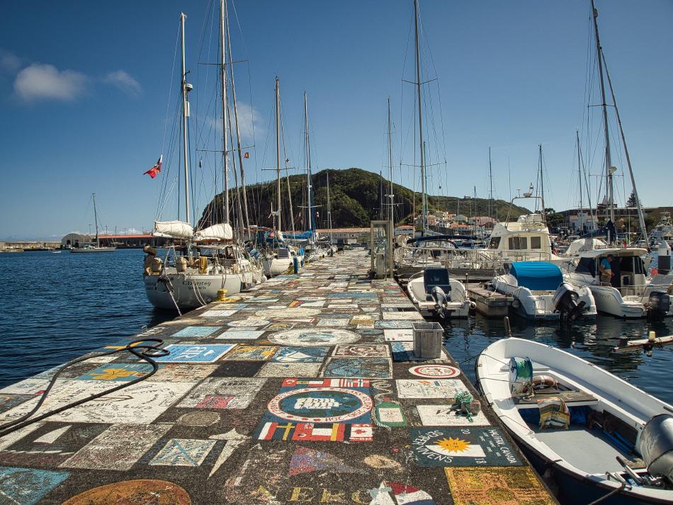 Von der Terrasse von Peters Cafe Sport aus hatten wir die ganze Zeit einen tollen Blick auf das Hafenbecken, in dem auch unzählige Segelboote und Yachten lagen. Dieser Segelboothafen, die Marina von Horta, war unser nächstes Ziel. Schon im Vorfeld hatten wir gelesen, dass es seit Ewigkeiten Tradition hat, dass Segler, die den Atlantik überqueren, in Horta eine Rast machen und sich hier kreativ an der Marina verewigen. So weit das Auge reicht, haben wir hier deshalb tausende bunte Bildchen und Texte, die auf den Stegen und allen angrenzenden Mauern aufgemalt waren, gesehen. Die Marina ist gar nicht übermäßig groß, aber eine wahrliche Farbenexplosion. Wir konnten sogar erkenne, dass bereits einige “ältere” Kunstwerke, die kaum noch zu erkennen waren, übermalt worden sind – aber auch, dass einige ältere Schätze aufpoliert worden sind und wieder in neuem Glanz erstrahlen.