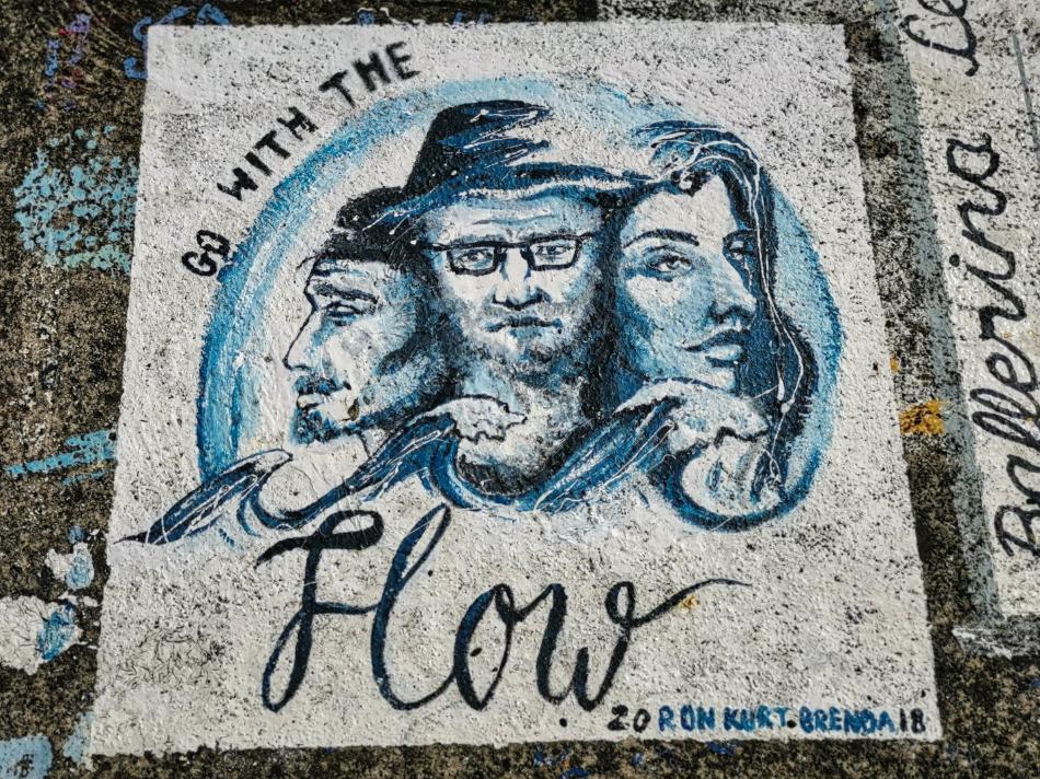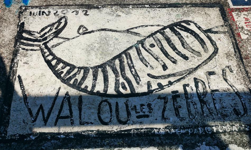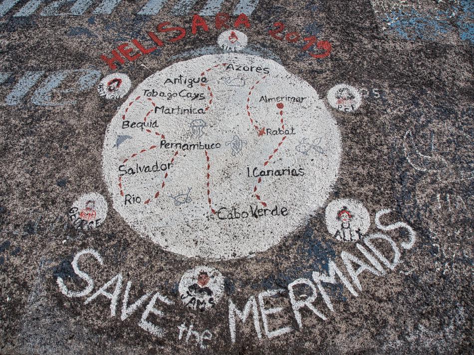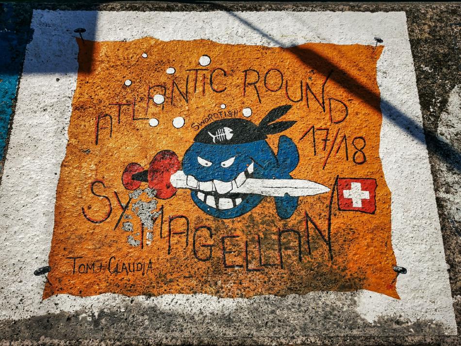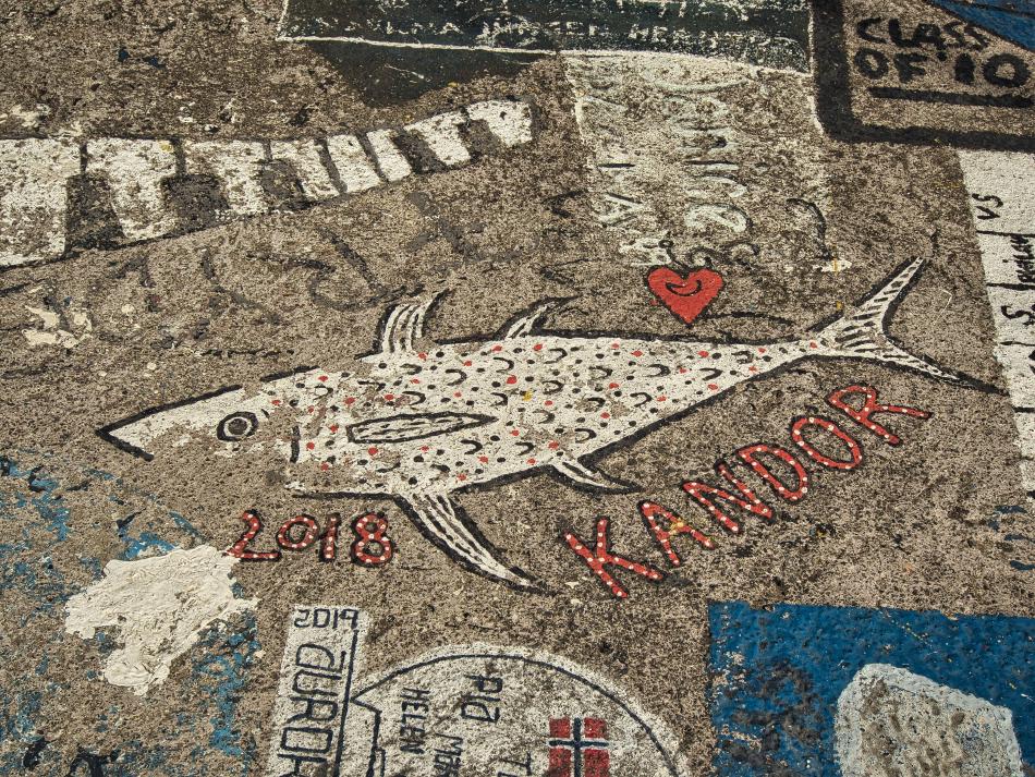 Von der Terrasse von Peters Cafe Sport aus hatten wir die ganze Zeit einen tollen Blick auf das Hafenbecken, in dem auch unzählige Segelboote und Yachten lagen. Dieser Segelboothafen, die Marina von Horta, war unser nächstes Ziel. Schon im Vorfeld hatten wir gelesen, dass es seit Ewigkeiten Tradition hat, dass Segler, die den Atlantik überqueren, in Horta eine Rast machen und sich hier kreativ an der Marina verewigen. So weit das Auge reicht, haben wir hier deshalb tausende bunte Bildchen und Texte, die auf den Stegen und allen angrenzenden Mauern aufgemalt waren, gesehen. Die Marina ist gar nicht übermäßig groß, aber eine wahrliche Farbenexplosion. Wir konnten sogar erkenne, dass bereits einige “ältere” Kunstwerke, die kaum noch zu erkennen waren, übermalt worden sind – aber auch, dass einige ältere Schätze aufpoliert worden sind und wieder in neuem Glanz erstrahlen.