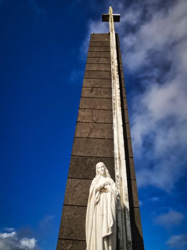 Nördlich von Horta gibt es einen weiteren Berg, der Horta von der nächsten Stadt im Norden, Praia do Almoxarife, trennt. Die Hauptstraße, die aus Horta heraus auf diesen Berg führt, führt an einem riesigen Monument vorbei: einem riesigen Kreuz mit einer etwas kleineren Statue. Um dieses Monument wurde ein großzügiger Aussichtspunkt errichtet, der den Namen Miradouro de Nossa Senhora de Conceição trägt. Die Besonderheit dieses Miradouros ist dabei nicht etwa die riesige Statue, sondern, dass man hier auf zwei Seiten eine grandiose Aussicht hat. Auf der Straßenseite, auf der das riesige Monument steht, hat man eine tolle Sicht über Horta, das große Hafenbecken und auch den Monte da Guia. Auf der anderen Straßenseite konnten wir die Stadt Praia da Almoxarife sehen.