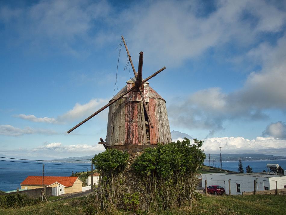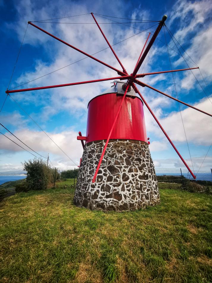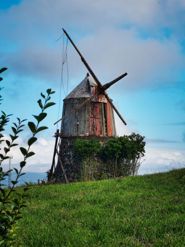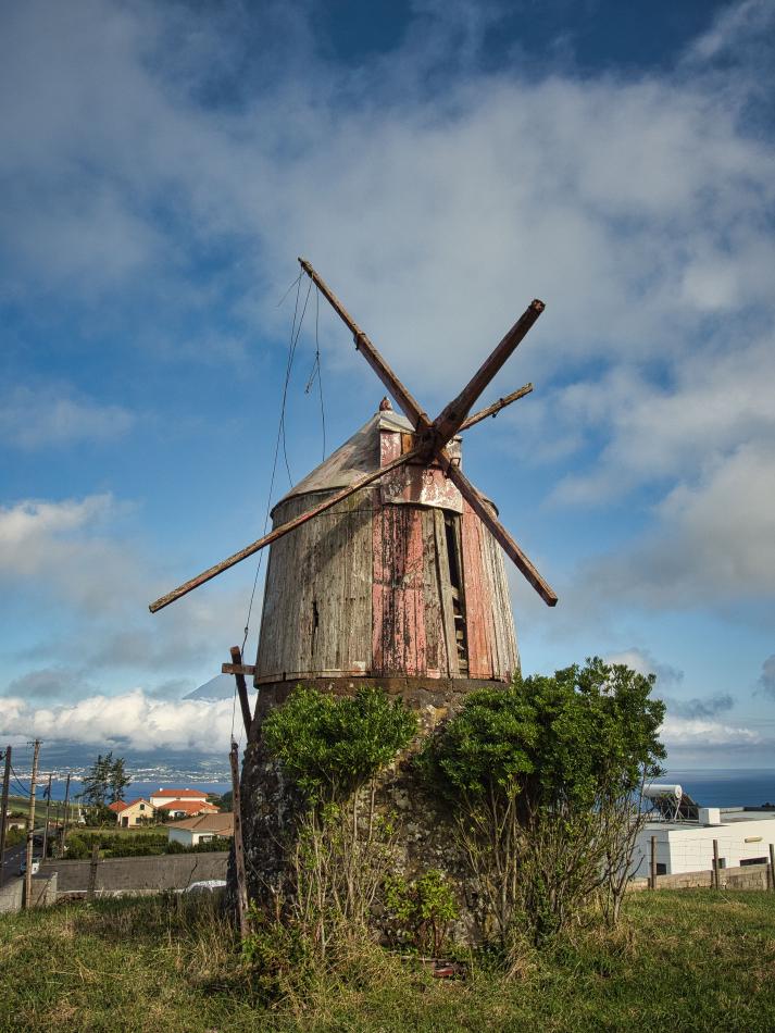 Überall auf den Azoren verstreute findet man viele dieser alten Windmühlen, mit ihrer ganz typischen azoreanischen Bauweise. Hier auf dem Berg zwischen Horta und Praia do Almoxarife standen an einer Nebenstraße direkt zwei dieser alten Gebäude auf benachbarten Wiesen. Wir wollten natürlich nah an die Windmühlen heran kommen, was sich allerdings als ganz schön kompliziert herausgestellt hat. Bei der einen Windmühle, die viel abgewrackter aussah, als die andere, konnten wir jedoch durch ein kaputtes Tor auf die Wiese laufen und einmal komplett um die Windmühle herum laufen. Von dieser Wiese aus konnte man von einigen Stellen auch ganz gut die zweite Windmühle, die etwas besser in Schuss war, sehen.