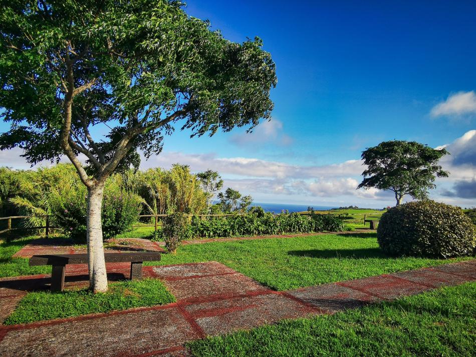 Bei dem einen Zwischenstopp an der Ruine in Chã da Cruz ist es nicht geblieben. Wir haben noch einen weiteren Halt am Aussichtspunkt Miradouro do Ribeiro Seco, ein paar Kilometer hinter der Ruine gemacht. Der Halt musste im Nachhinein aber nicht unbedingt sein: Viel mehr als ein paar schöne Blüten und einen mittelmäßigen Blick auf das blaue Meer konnten wir hier nicht sehen.
