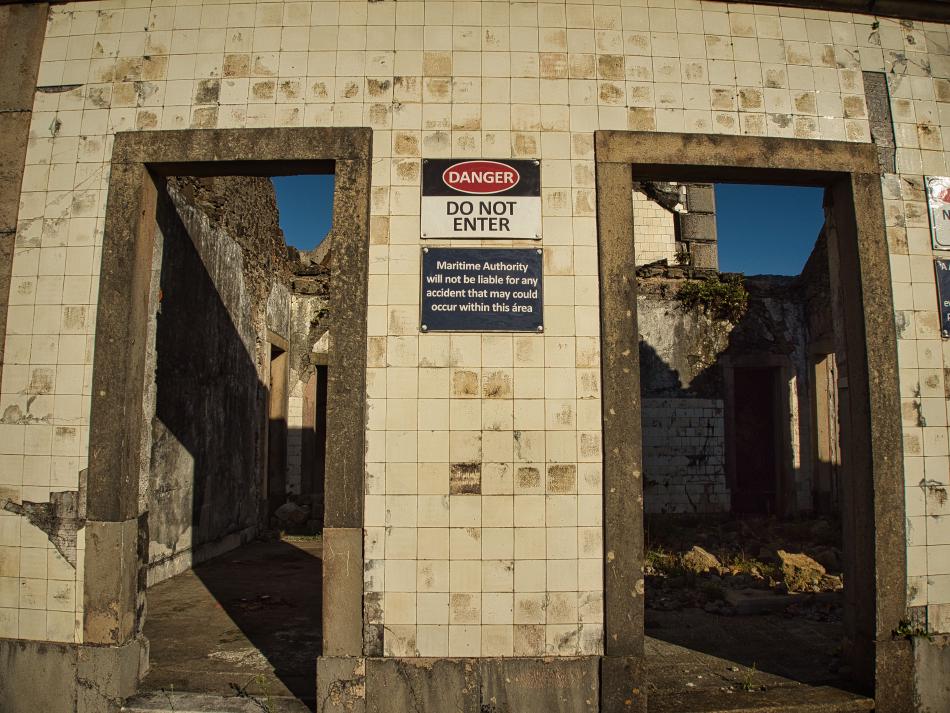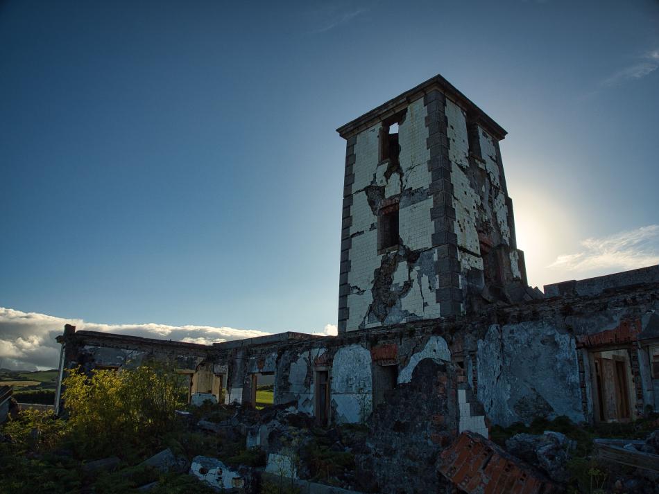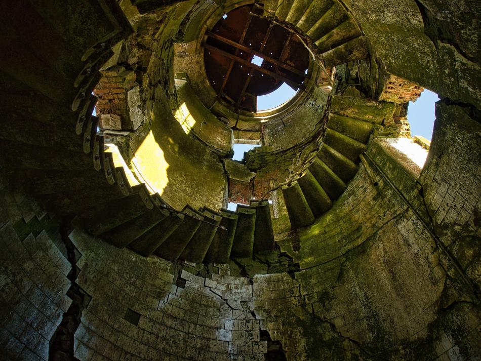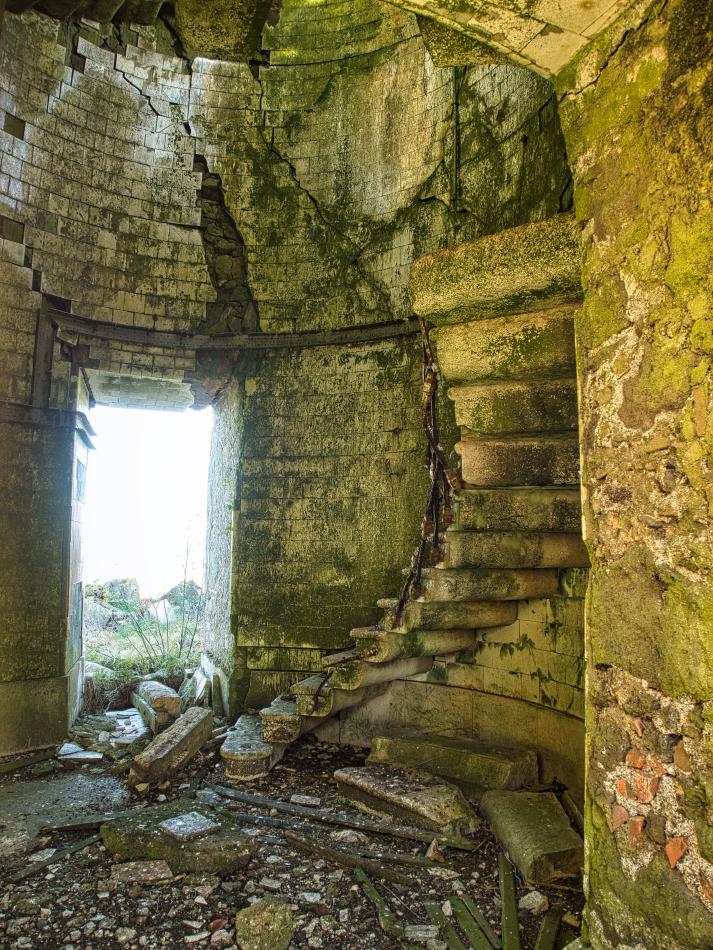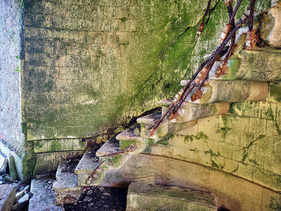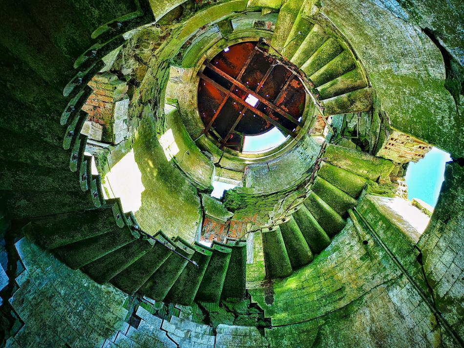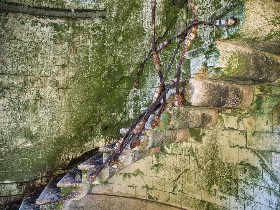 Das Gebäude um den Leuchtturm herum ist fast genau so kaputt, wie die Kirche, die wir zuvor besucht hatten. Der Unterschied hier ist nur, dass die Treppe, die den Turm hinauf führt, noch gut erhalten ist. Wir erinnern noch einmal an den gesunden Menschenverstand, der uns davon abgehalten hat, die Treppe hinauf zu laufen; die Treppe aber von unten zu betrachten ist schon ein Highlight für sich. Besonders toll ist der verrostete Stahl und die komplett vermoosten Wände. Shabby Chic vom feinsten!